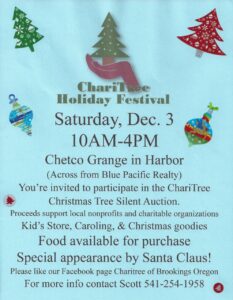 When: December 3, 2016 from 10am – 4pmWhere: Chetco Grange in Harbor – Across from Blue Pacific RealtyWhy: Christmas Tree Silent AuctionProceeds support local nonprofits and charitable organizations